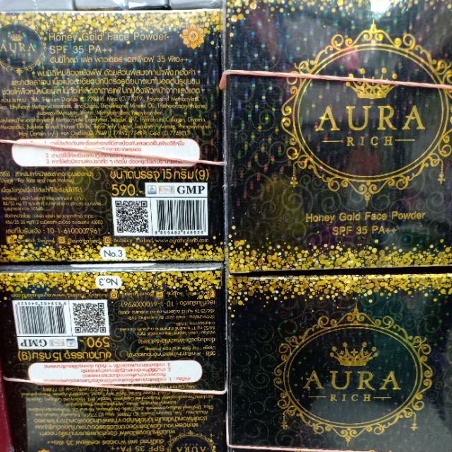แป้ง aura rich 2 ชิ้น ต่อ 1 ออเดอร์ นะคะ AuraRich Honey Gold Face Powder SPF35 PA++ ออร่าริช ฮันนี่โกลด์ เฟช พาวเดอร์ แป้งน้ำผึ้งทองคำ ปกปิดเนียนกริ๊บ บางเบา คุมมัน กันน้ำ (ขนาด 15 กรัม) คุณสมบัติ ออร่าริชฮันนี่โกลด์เฟชพาวเดอร์ พบมิติใหม่แห่งวงการแป้งพัฟ ด้วยส่วนผสมของน้ำผึ้งทองคำ และคอลลาเจน เนื้อแป้งเนียนละเอียดปกปิดริ้วรอยบางเบาไม่อุดตันรูขุมขน ช่วยให้ผิวหน้าเนียนใส ไม่ก่อให้เกิดอาการแพ้ ปกป้องผิวหน้าจากแสงแดด วิธีใช้ : ใช้สำหรับทาหน้าและลำคอ ก่อนแต่งหน้า ขนาด 15 กรัม เลขจดแจ้ง : 10-1-6010040840 แป้งออร่าริช aurarich ออร่าริชของแท้ มี 3 เบอร์ เบอร์ 1 สำหรับผิวขาว เบอร์ 2 สำหรับผิวสองสี เบอร์ 3 สำหรับผิวสองสี-ผิวคล้ำ
